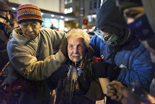 | A protester gets sprayed in the face with pepper spray at an Occupy Portland protest. |